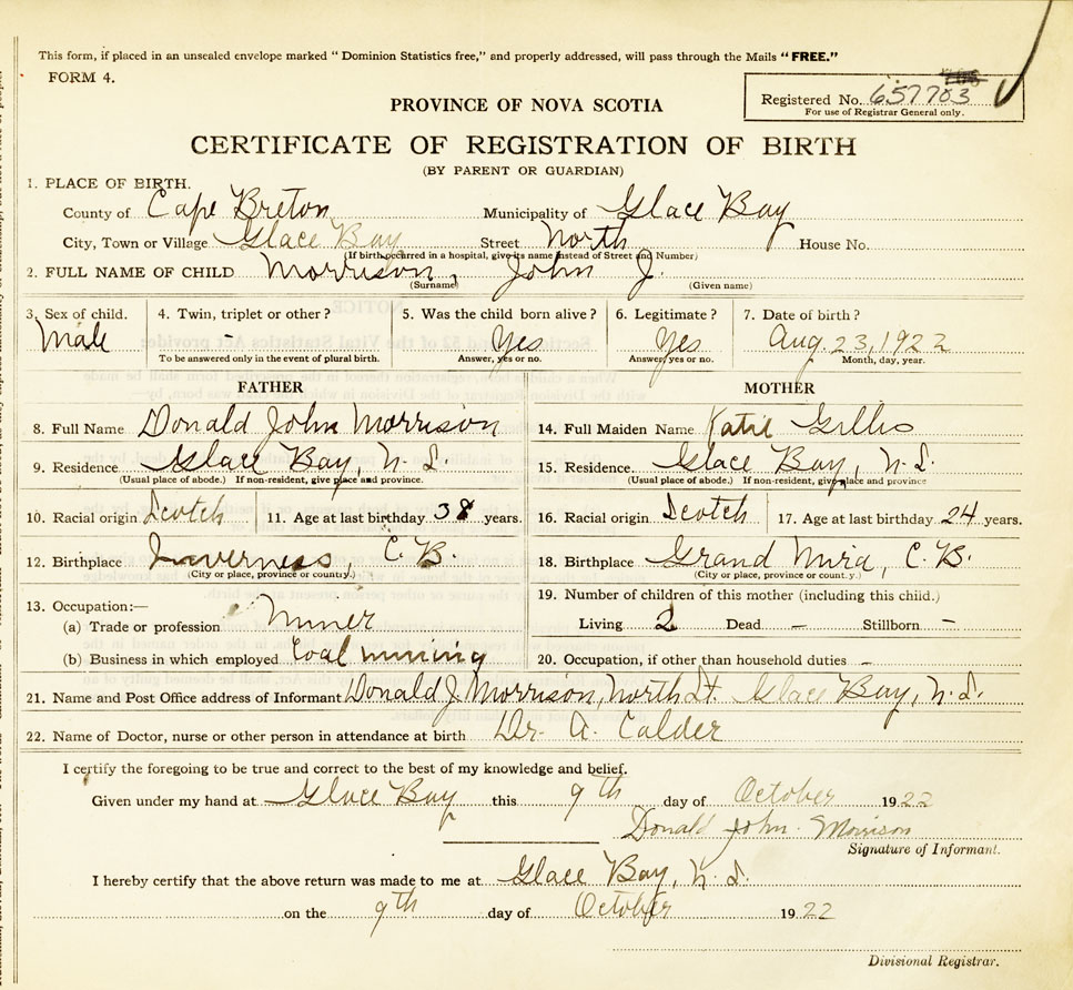 21. Name and Post Office address of Informant Donald John Morrison North St., Glace Bay