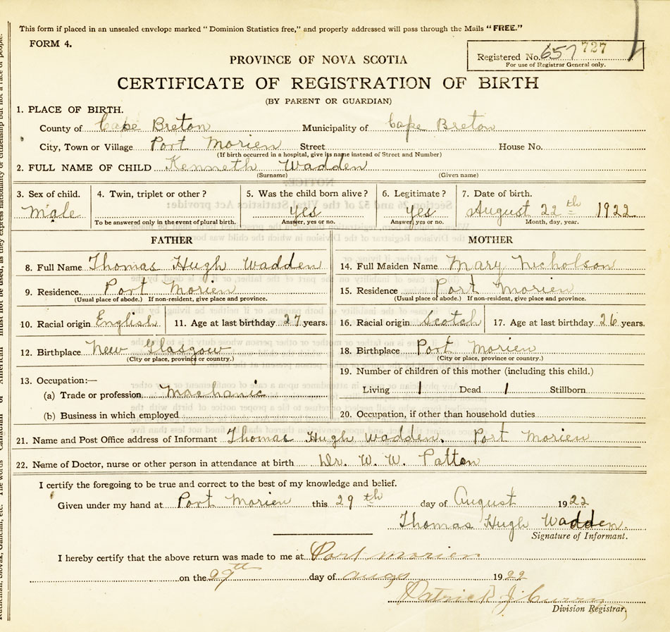 21. Name and Post Office address of Informant Thomas Hugh Wadden Port Morien