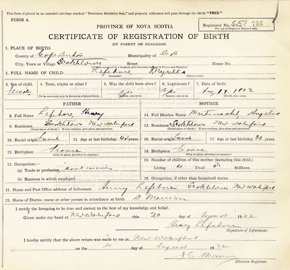 21. Name and Post Office address of Informant Henry Lefebvre Scotchtown, New Waterford