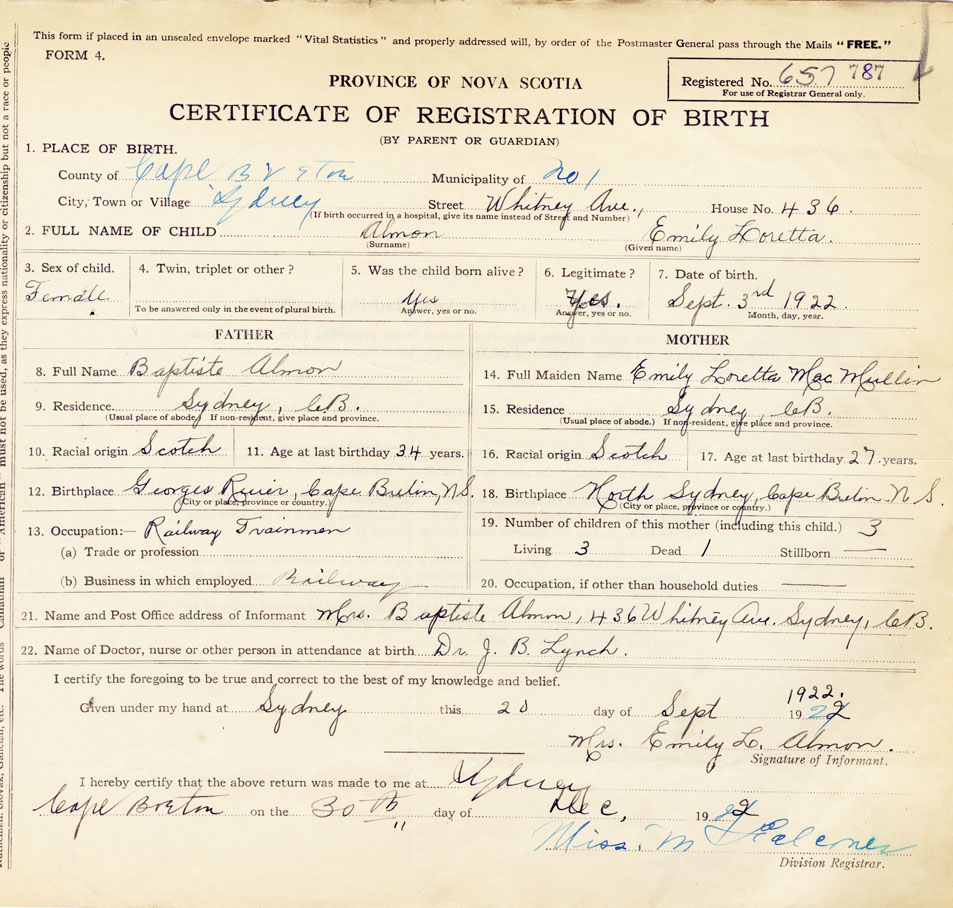 21. Name and Post Office address of Informant Mrs (Baptiste) Emily L Almon 436 Whitney Ave., Sydney, CB