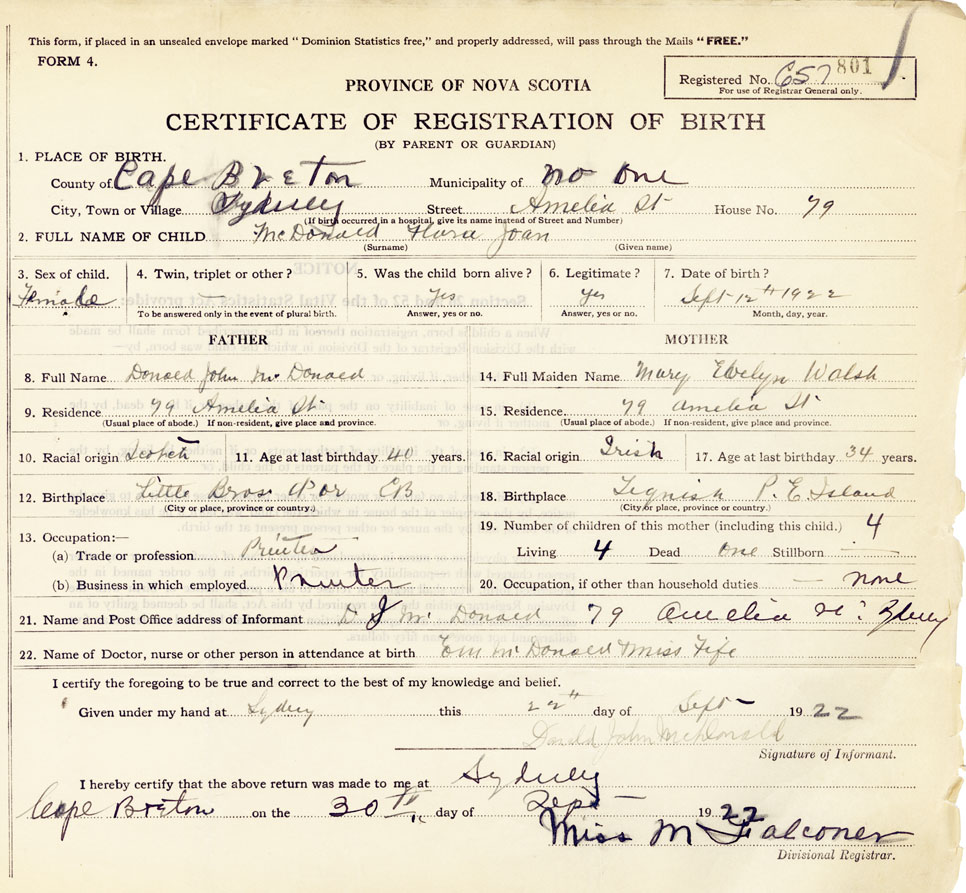 21. Name and Post Office address of Informant Donald John McDonald 79 Amelia St., Sydney