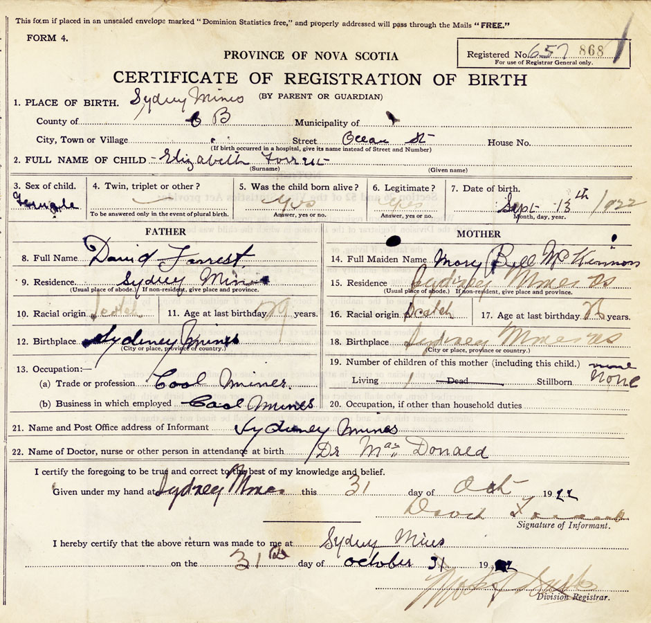 22. Name of Doctor, nurse or other person in attendance at birth Dr. MacDonald