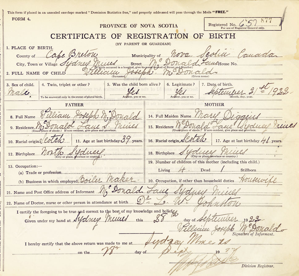 21. Name and Post Office address of Informant McDonald Lane, Sydney Mines
