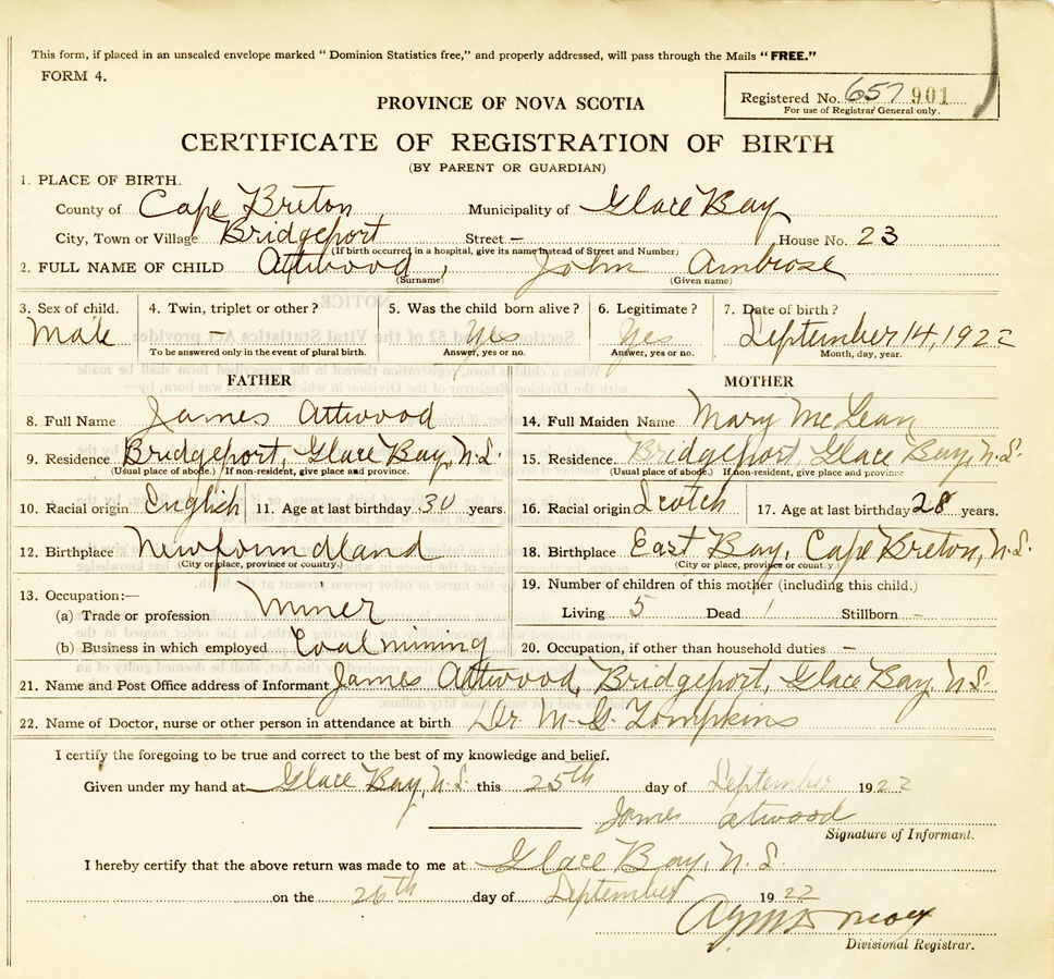 21. Name and Post Office address of Informant James Atwood, Bridgeport, Glace Bay