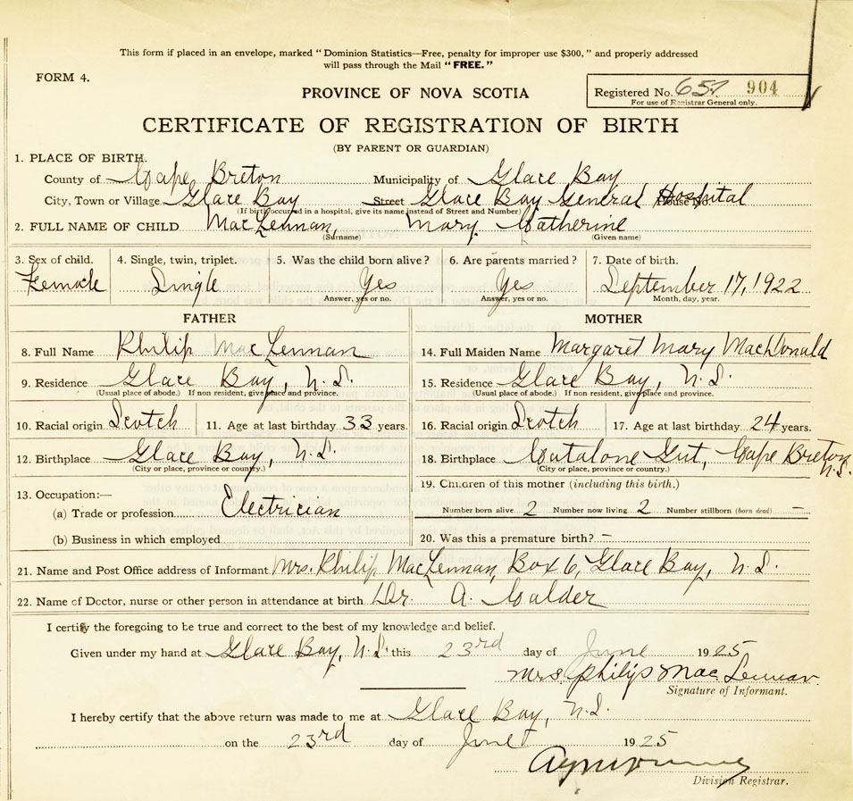 21. Name and Post Office address of Informant Mrs Philip MacLennan, Box 6, Glace Bay