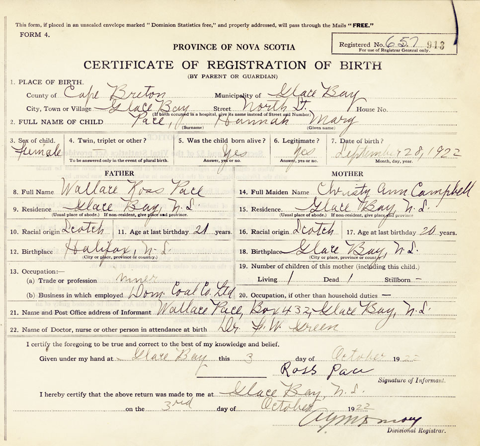 21. Name and Post Office address of Informant Wallace Ross Pace, Box 432, Glace Bay