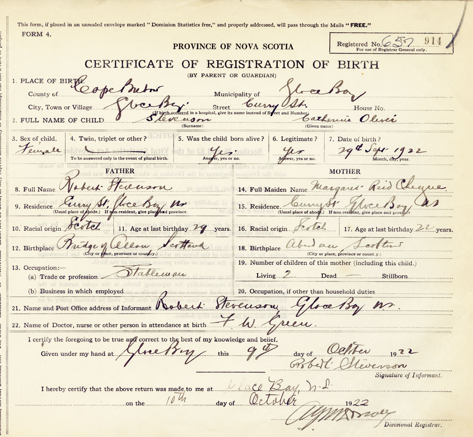 21. Name and Post Office address of Informant Robert Stevenson Glace Bay.