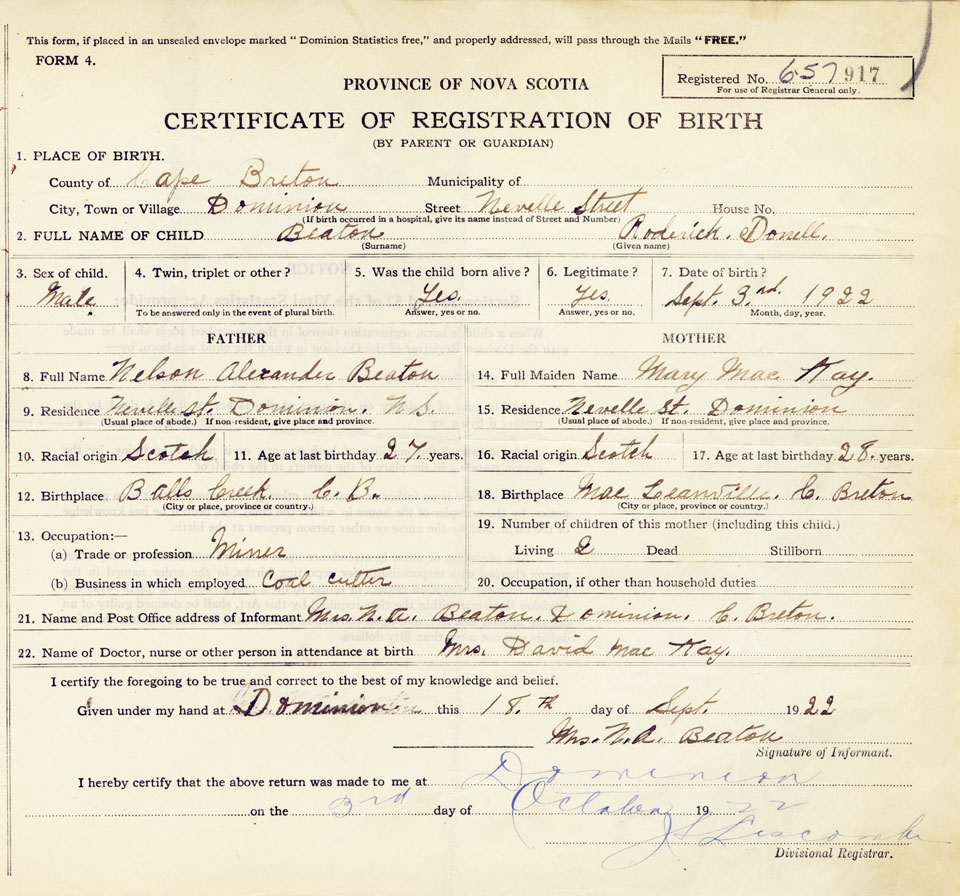 21. Name and Post Office address of Informant Mrs N A Beaton, Dominion, C. Breton