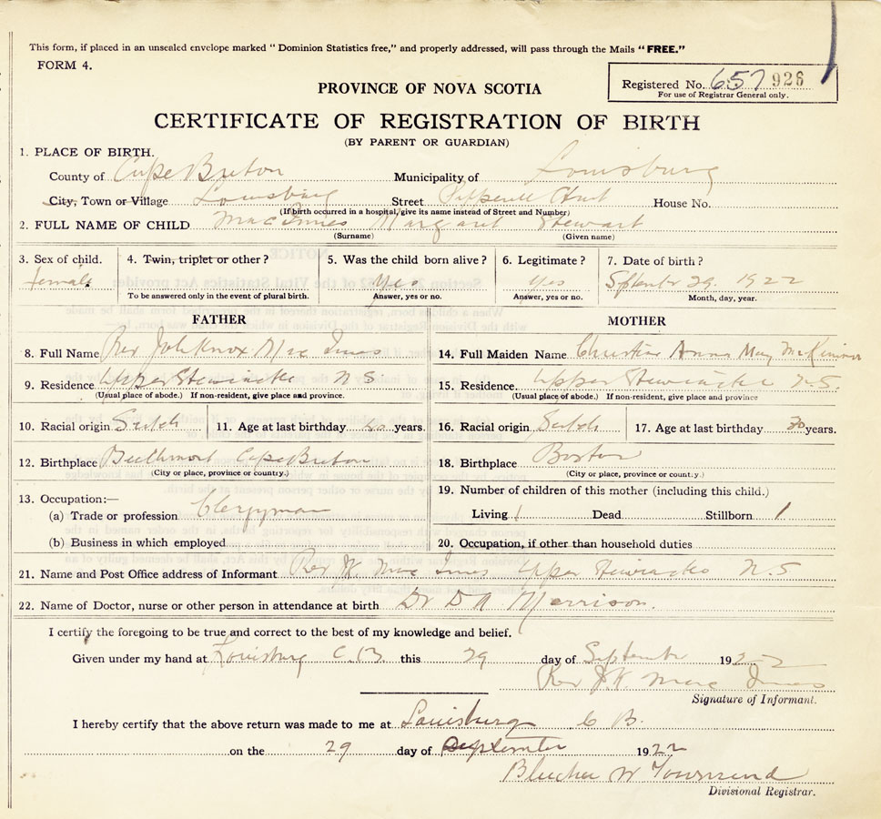 21. Name and Post Office address of Informant Rev. J K MacInnis, Upper Stewiacke