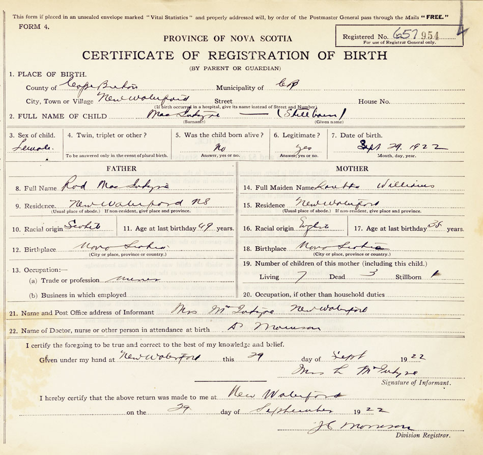21. Name and Post Office address of Informant Mrs L MacIntyre, New Waterford