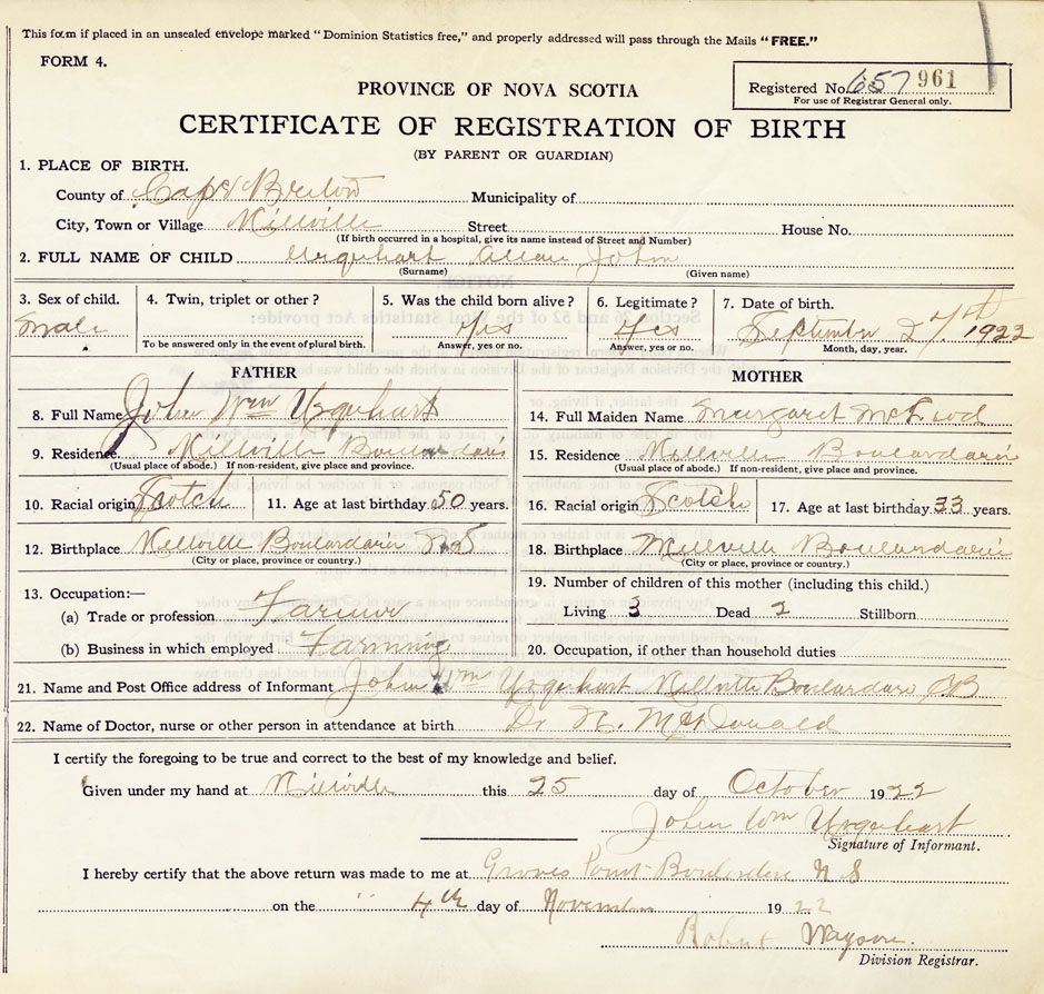 21. Name and Post Office address of Informant John Wm. Urquhart, Millville, Boularderie, CB