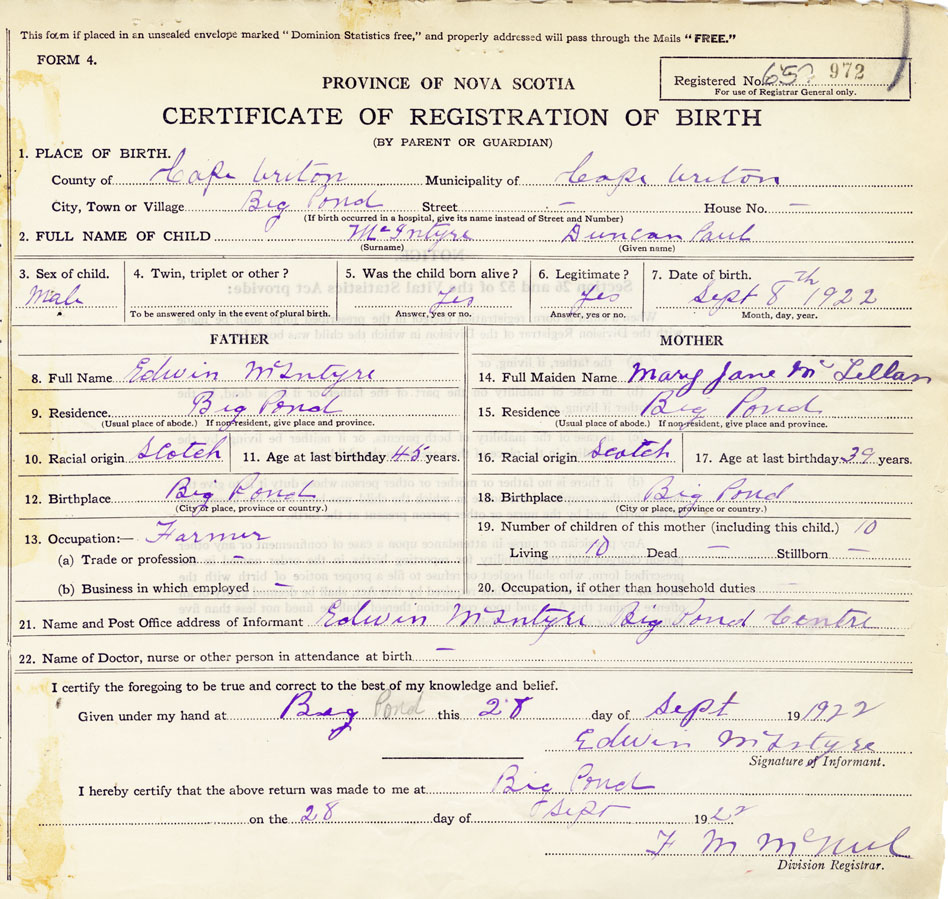 21. Name and Post Office address of Informant Edwin MacIntyre, Big Pond Centre