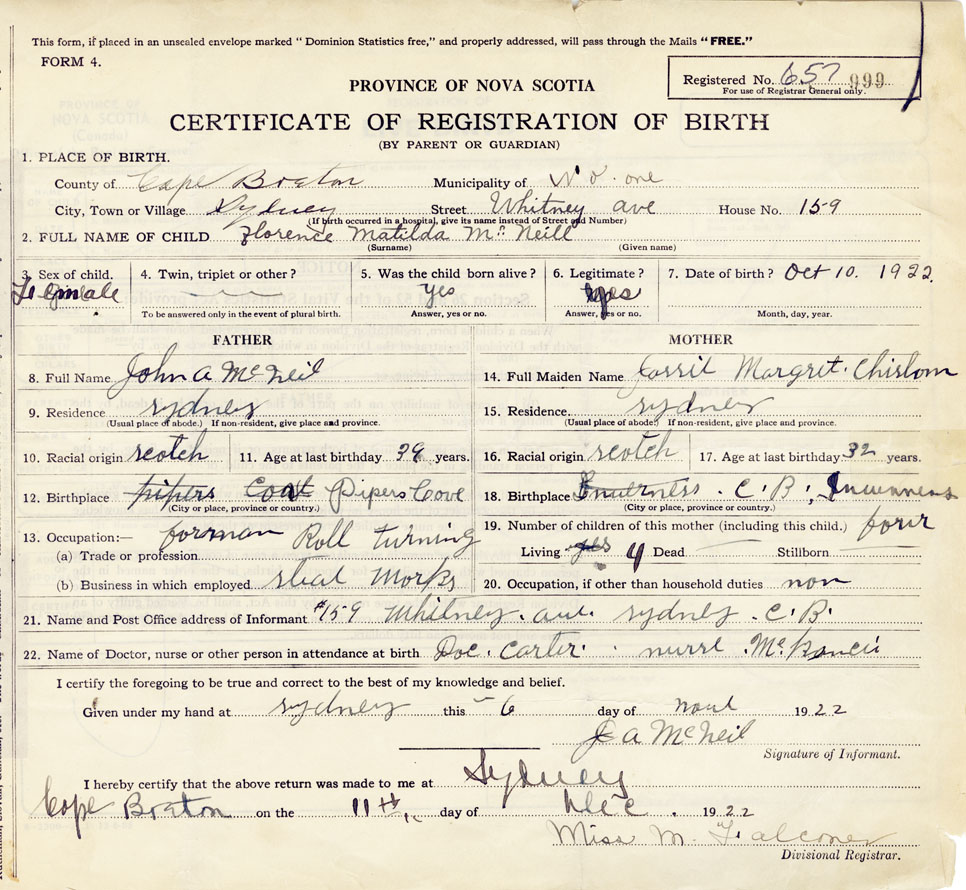 21. Name and Post Office address of Informant J A McNeil, 159 Whitney Ave., Sydney, CB