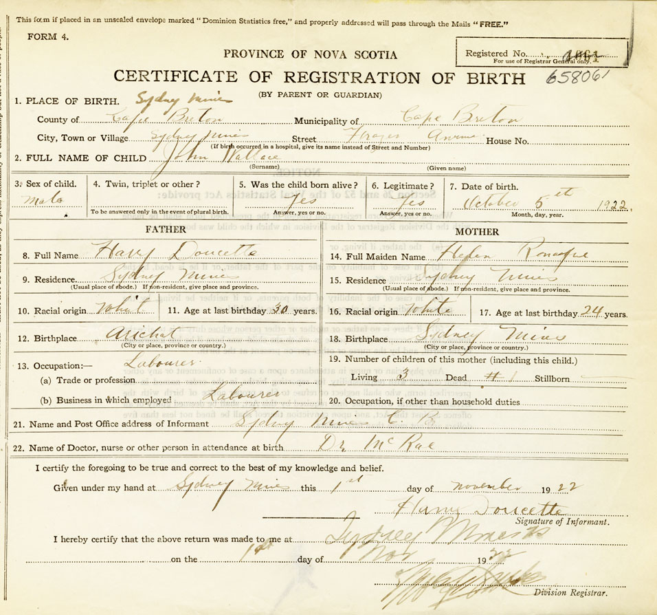 21. Name and Post Office address of Informant Harry Doucette, Sydney Mines, CB