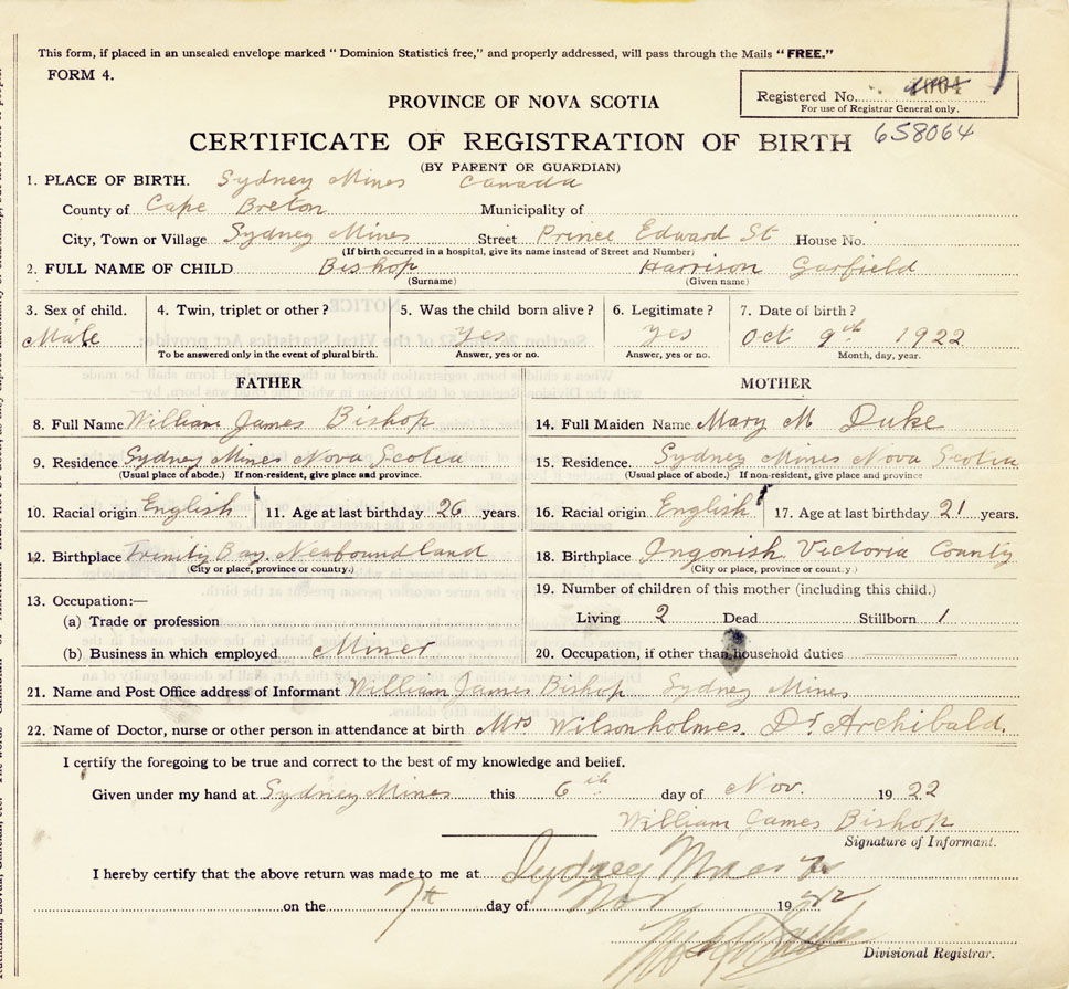 21. Name and Post Office address of Informant William James Bishop, Sydney Mines