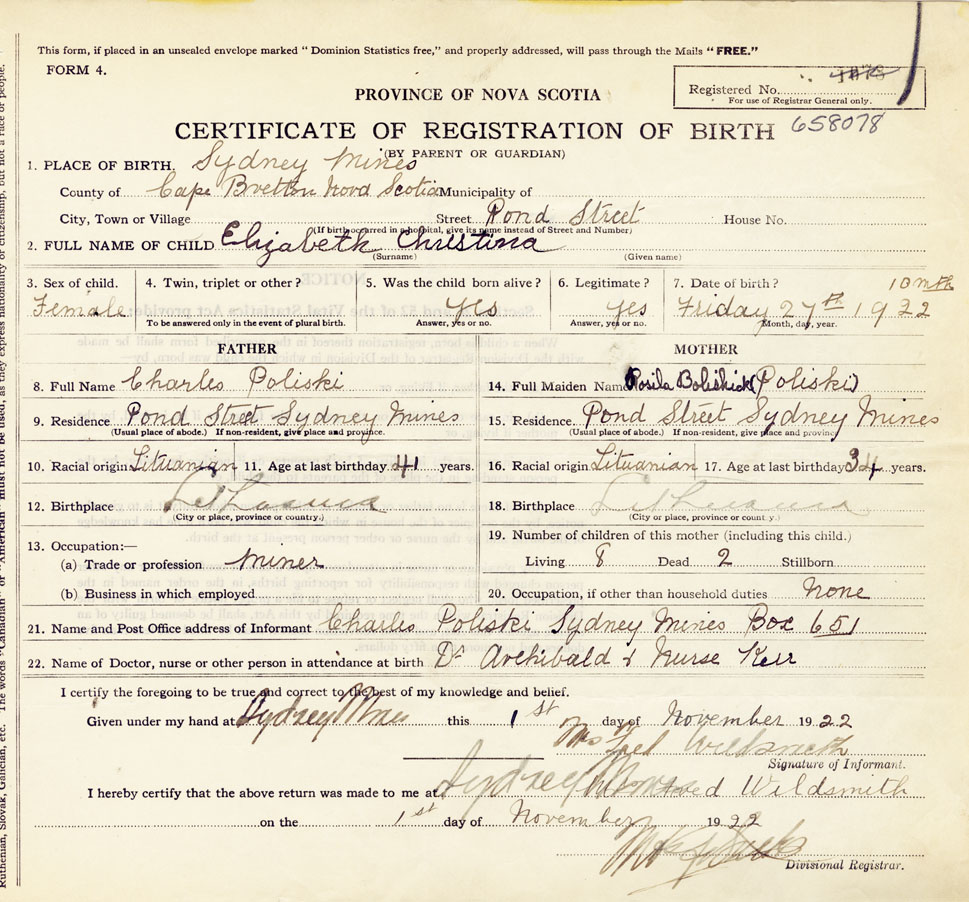 21. Name and Post Office address of Informant Charles Poliski, Sydney Mines, Box 651