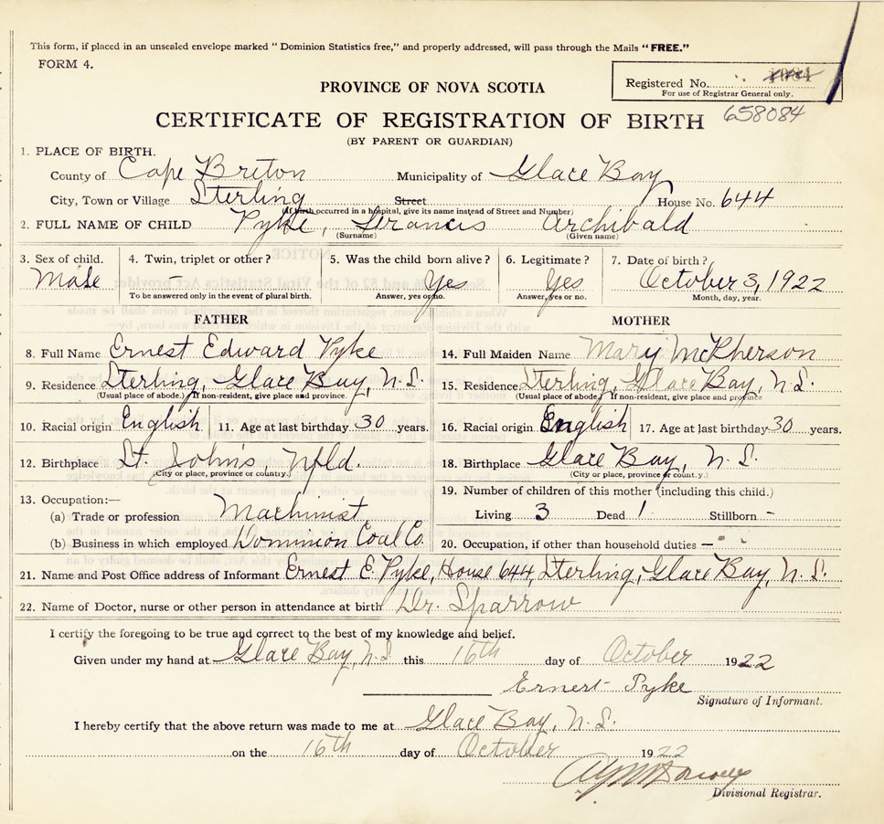21. Name and Post Office address of Informant Ernest E. Pyke House 644, Sterling, Glace Bay