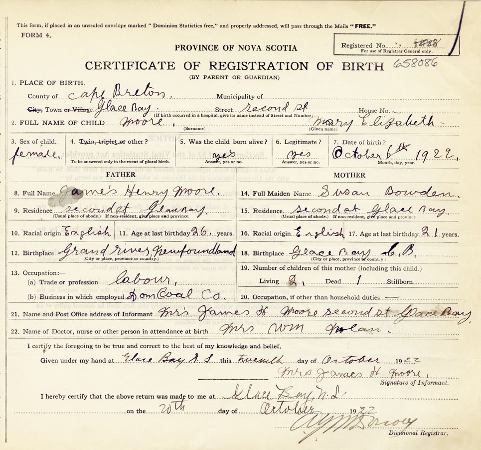 21. Name and Post Office address of Informant Mrs James H. Moore Second St., Glace Bay