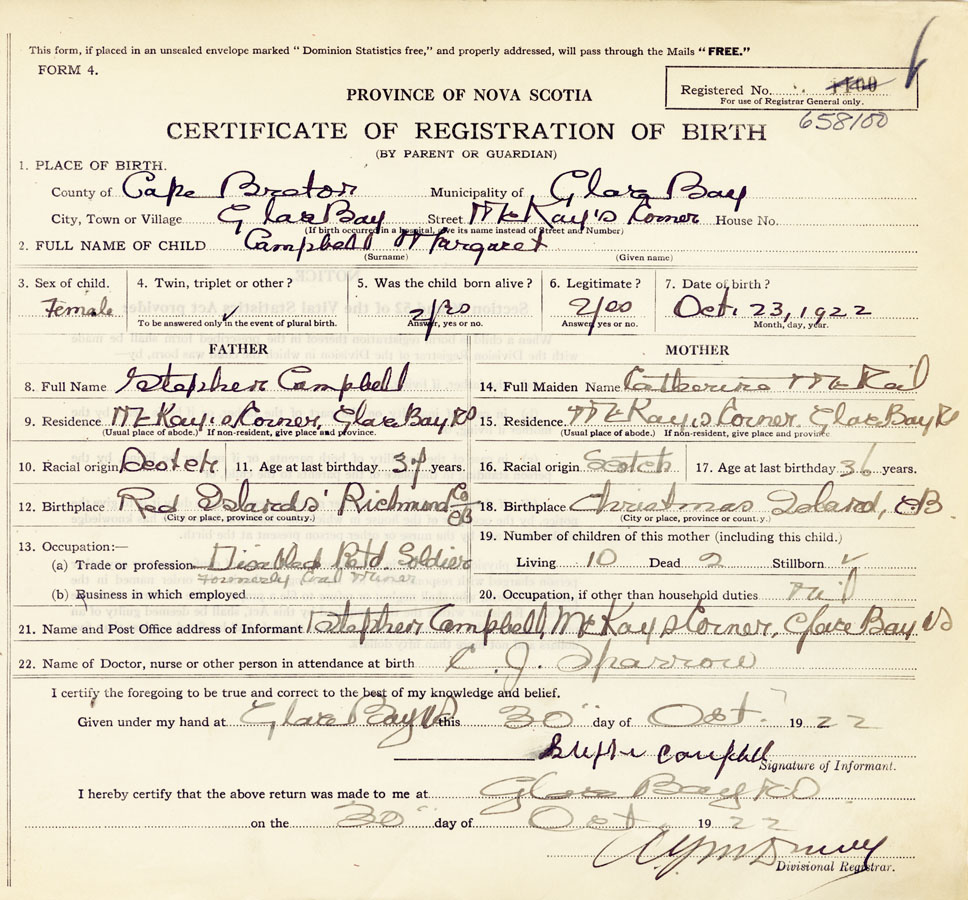21. Name and Post Office address of Informant Stephen Campbell, McKays Corner, Glace Bay