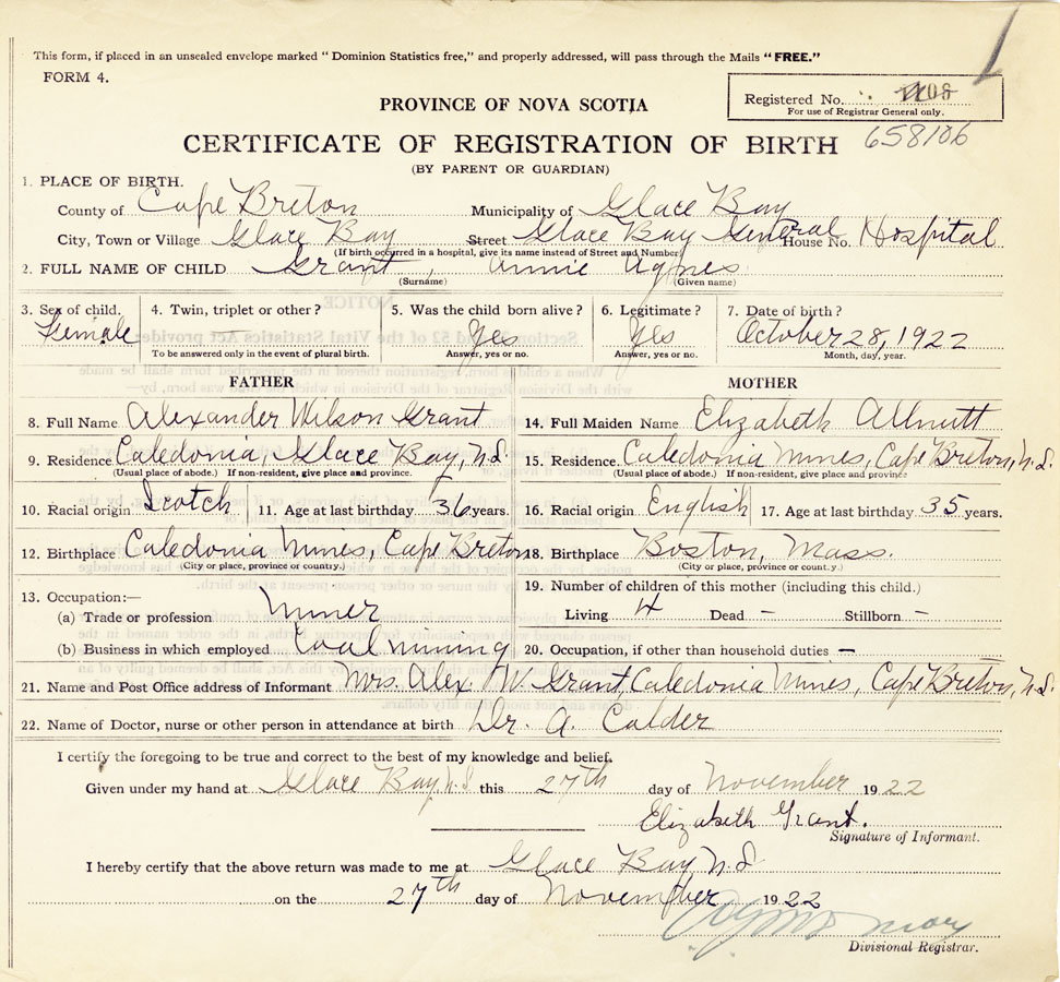 21. Name and Post Office address of Informant Mrs. Alex. W. Grant Caledonia Mines, Cape Breton