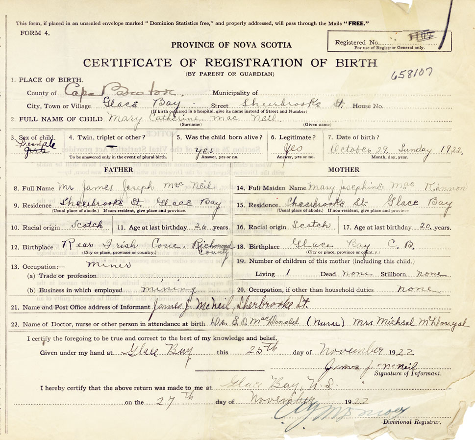 21. Name and Post Office address of Informant James J McNeil Sheerbrooke St, Glace Bay