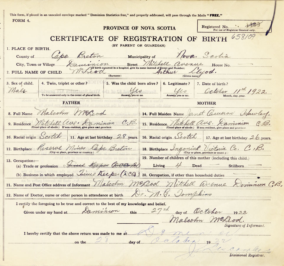 21. Name and Post Office address of Informant Malcolm McLeod Mitchell Ave, Dominion C.B.