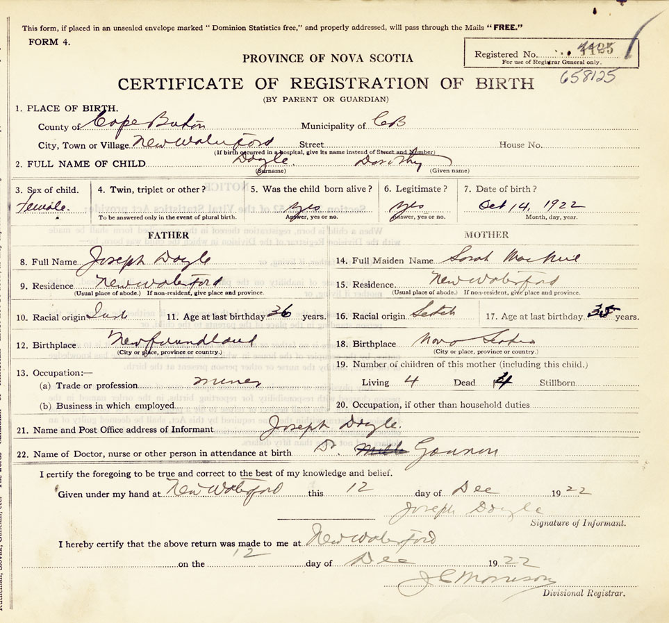 21. Name and Post Office address of Informant Joseph Doyle New Waterford