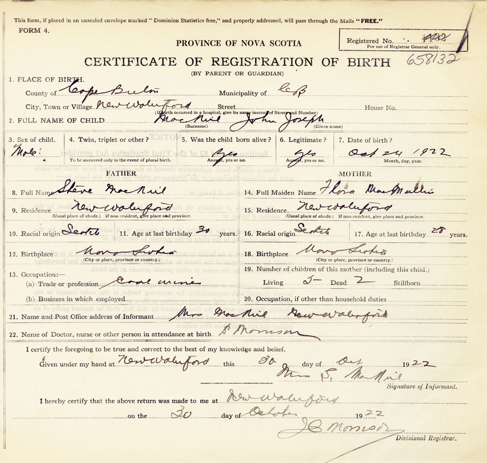 21. Name and Post Office address of Informant Mrs. MacNeil New Waterford
