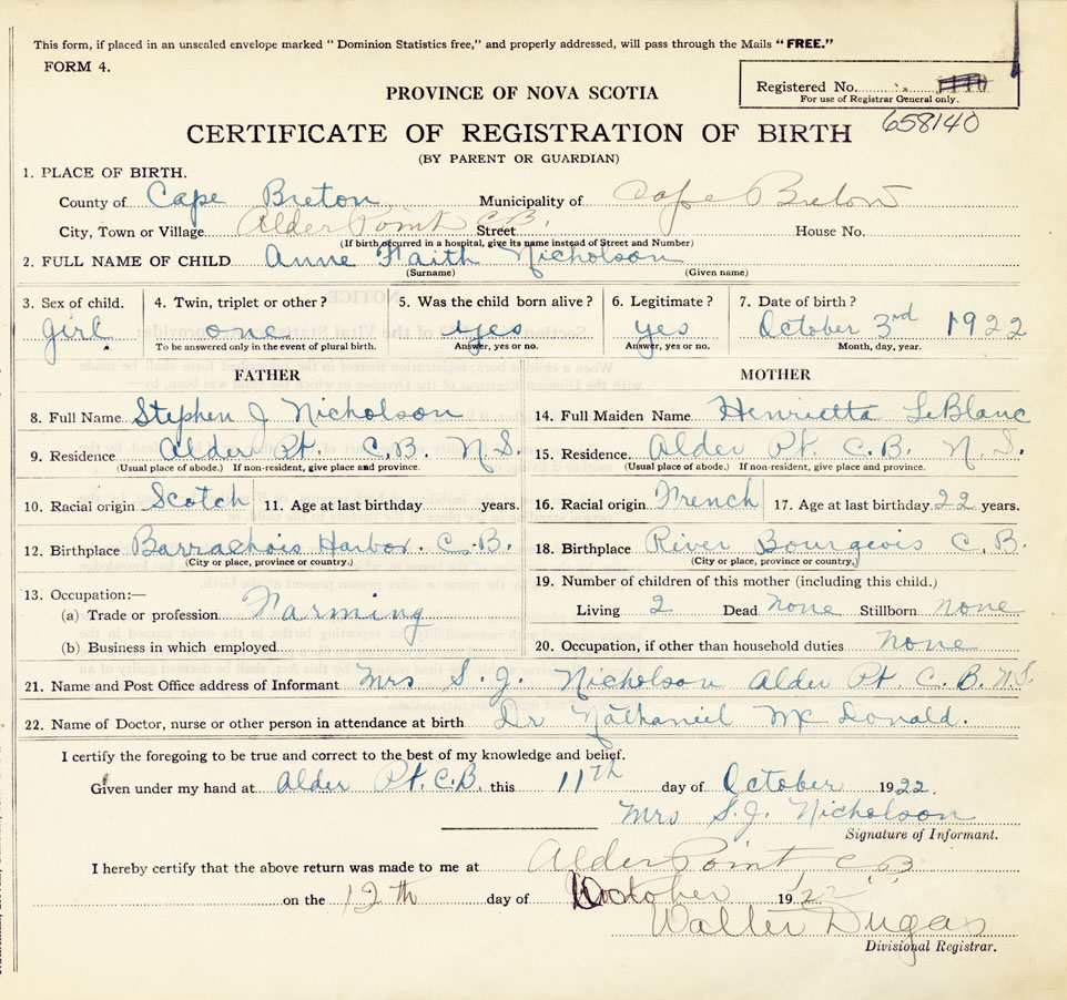 21. Name and Post Office address of Informant Mrs. Stephen Joseph Nicholson Alder Point, Cape Breton