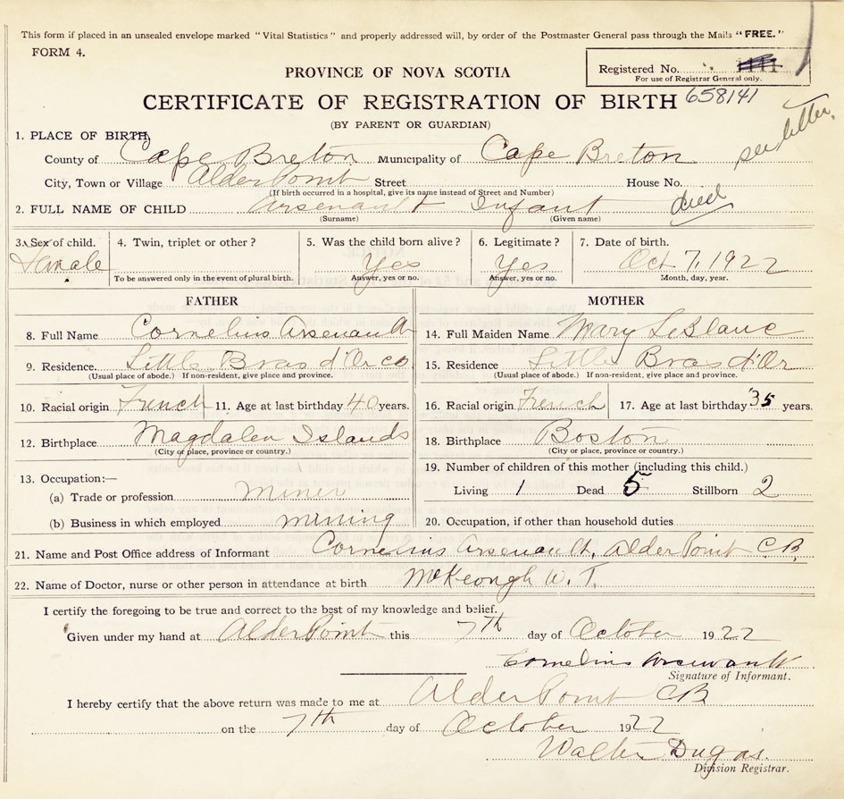 21. Name and Post Office address of Informant Cornelius Arsenault Alder Point, Cape Breton