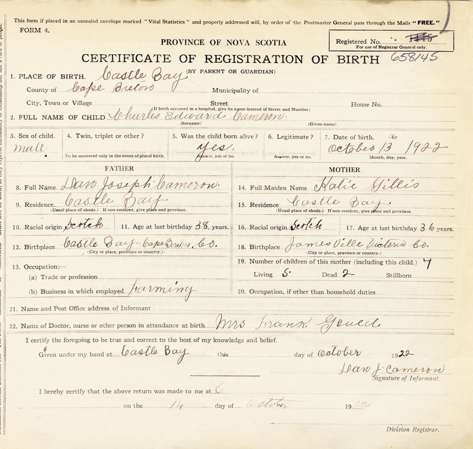 12. Birthplace Castle Bay, Cape Breton County
