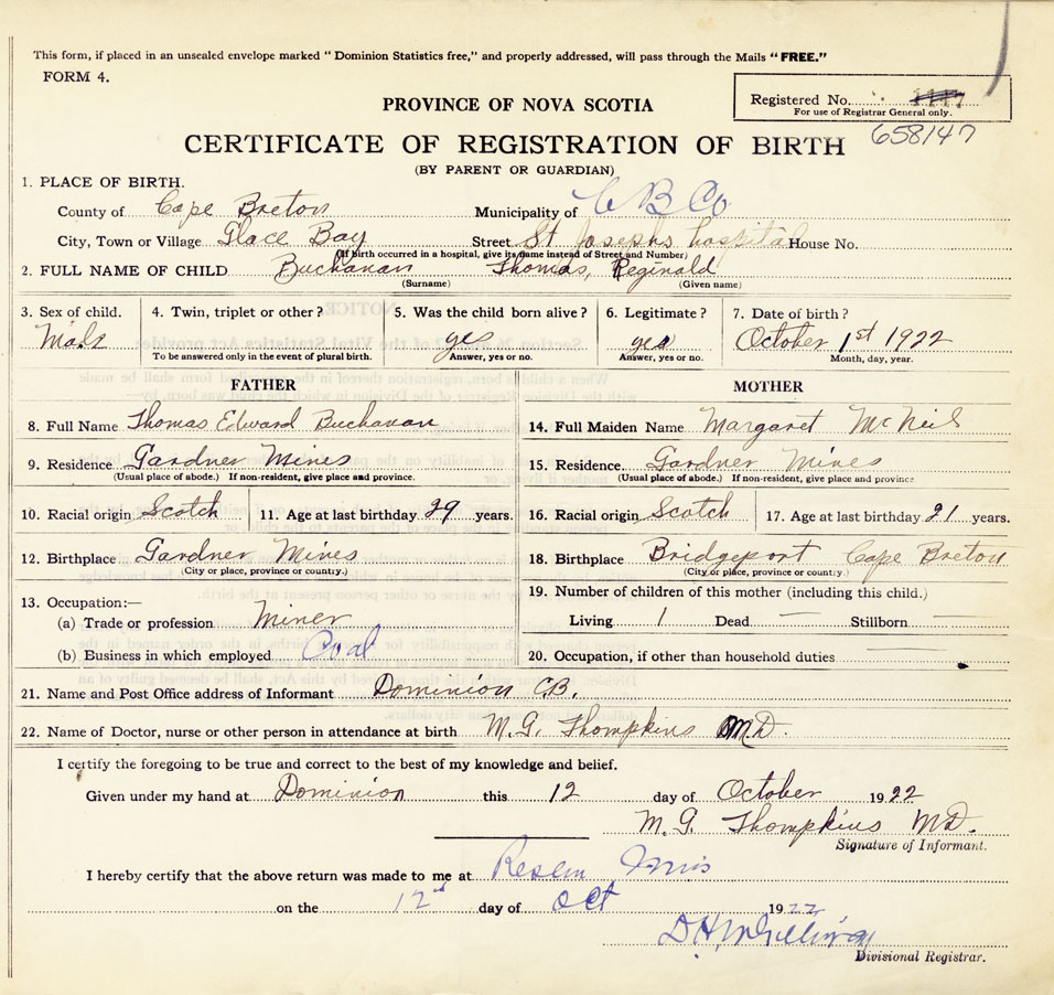 21. Name and Post Office address of Informant Dominion, Cape Breton