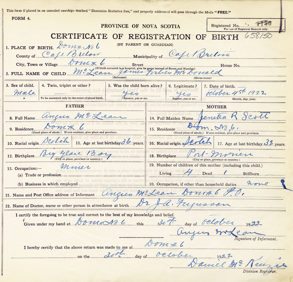 21. Name and Post Office address of Informant Angus McLean Dominion No. 6 Post Office