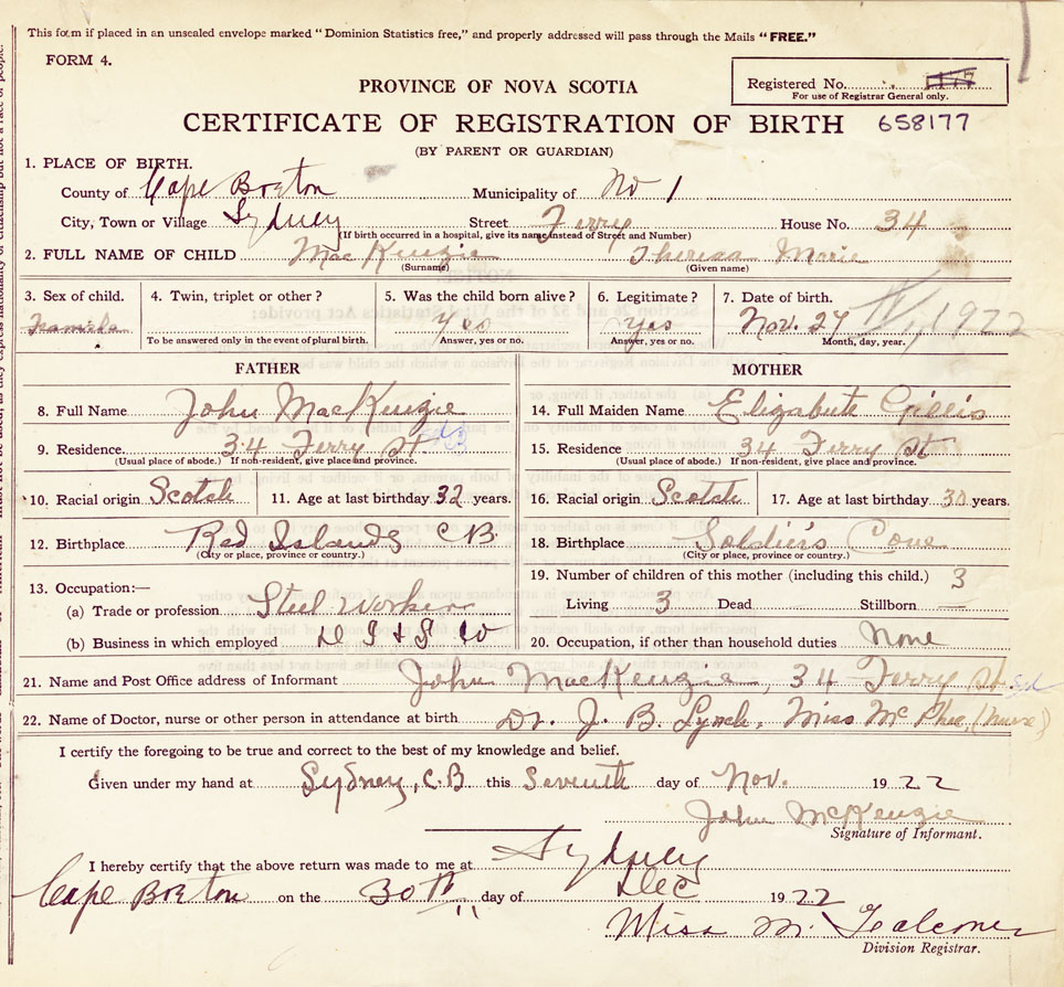 21. Name and Post Office address of Informant John MacKenzie 34 Ferry St., Sydney, Cape Breton