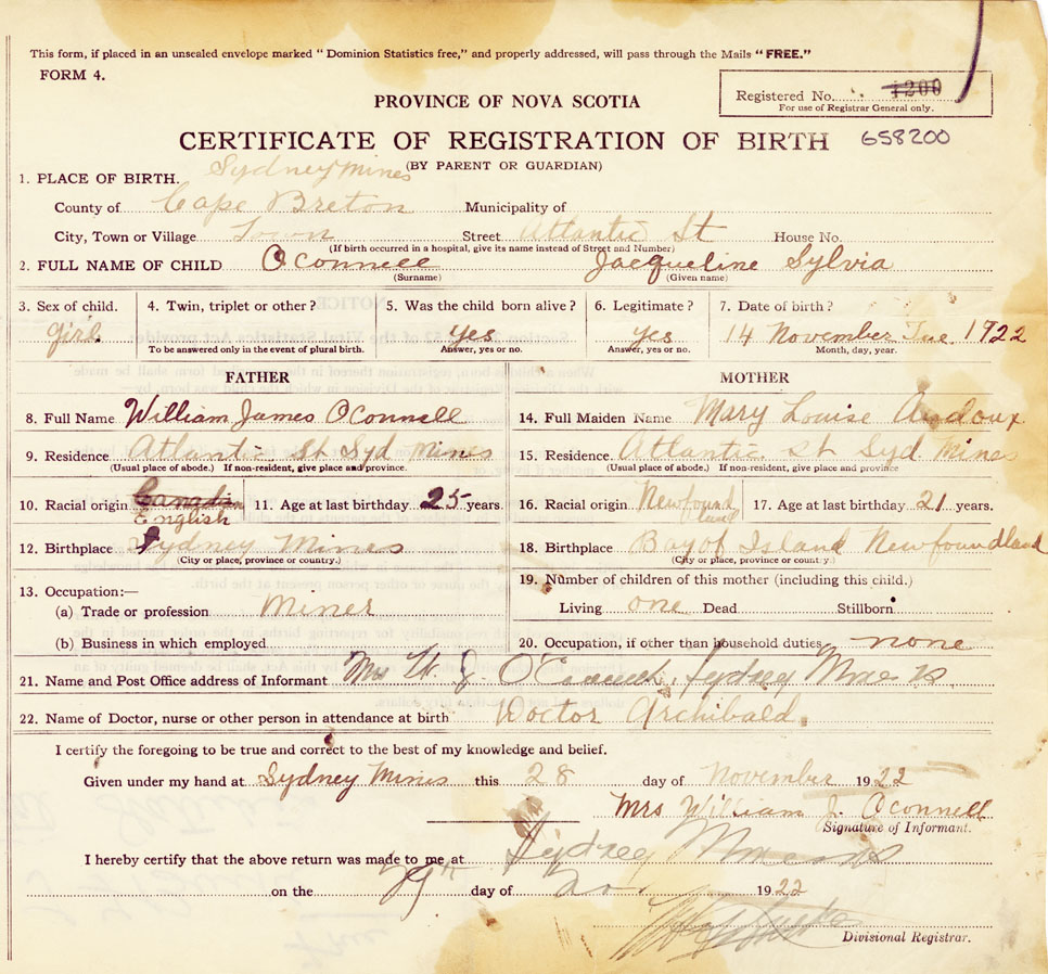 21. Name and Post Office address of Informant Mrs William J O'Connell Sydney Mines