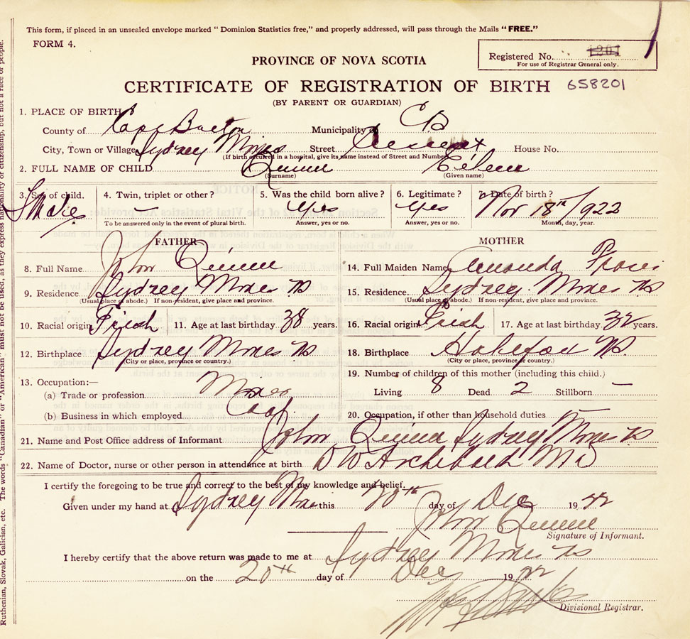 21. Name and Post Office address of Informant John Quinn, Sydney Mines