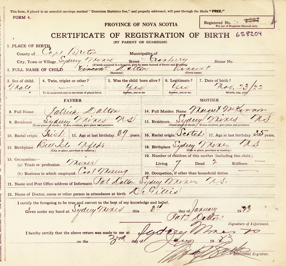 21. Name and Post Office address of Informant Pat Dalton, Sydney Mines