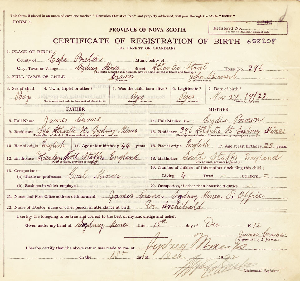 21. Name and Post Office address of Informant James Crane, Sydney Mines, P. Office