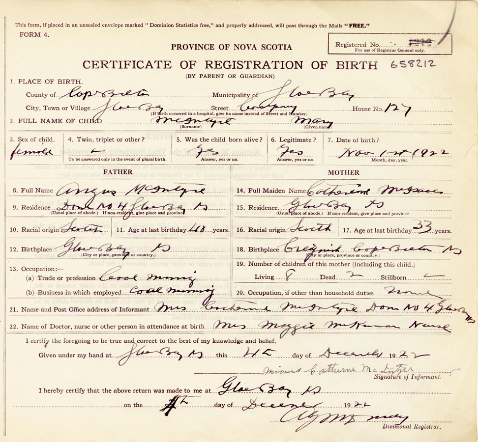 21. Name and Post Office address of Informant Mrs Catherine McIntyre, Dom. no 4, Glace Bay