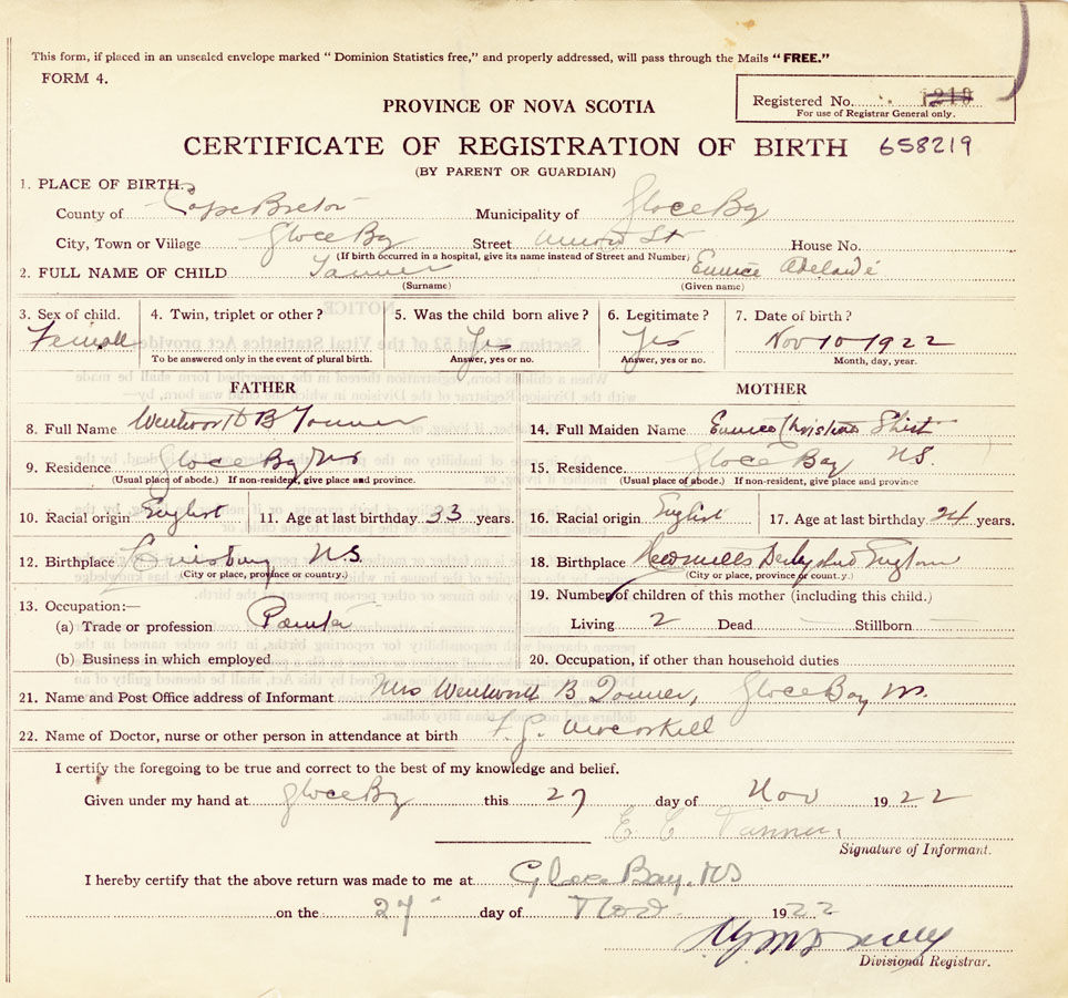 21. Name and Post Office address of Informant Mrs Wentworth Tanner, Glace Bay