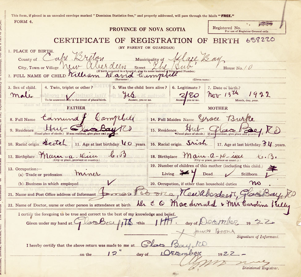 21. Name and Post Office address of Informant James Boone New Aberdeen, Glace Bay