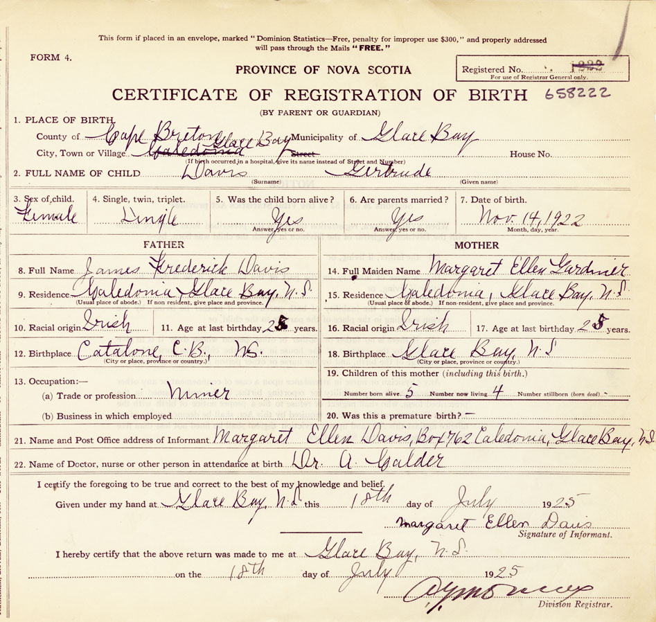 21. Name and Post Office address of Informant Margaret Ellen Davis, Box 762, Caledonia, Glace Bay