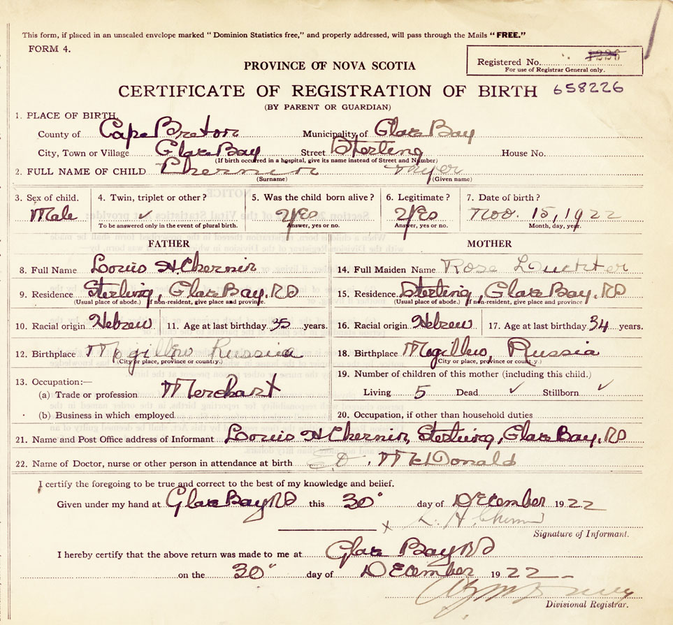 21. Name and Post Office address of Informant Louis H Chernir Sterling, Glace Bay