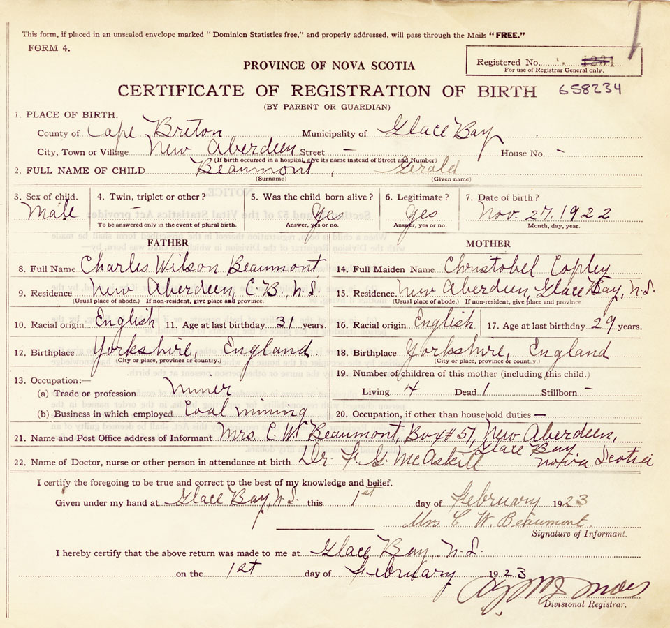 21. Name and Post Office address of Informant Mrs C W Beaumont, Box #57, New Aberdeen, Glace Bay