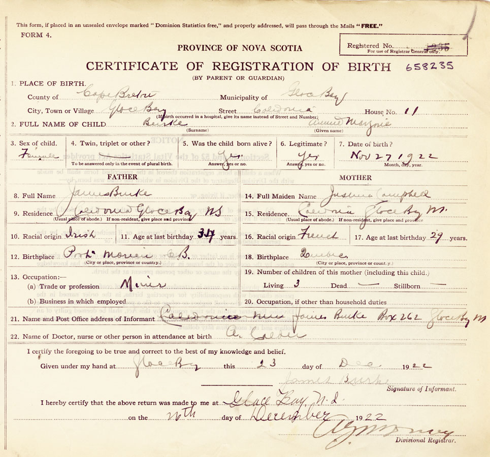 21. Name and Post Office address of Informant James Burke, Box 262, Glace Bay