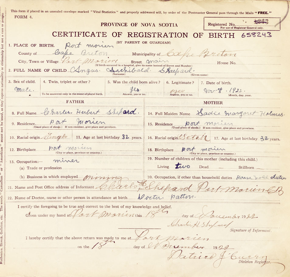 21. Name and Post Office address of Informant Charles H Shepard, Port Morien, CB