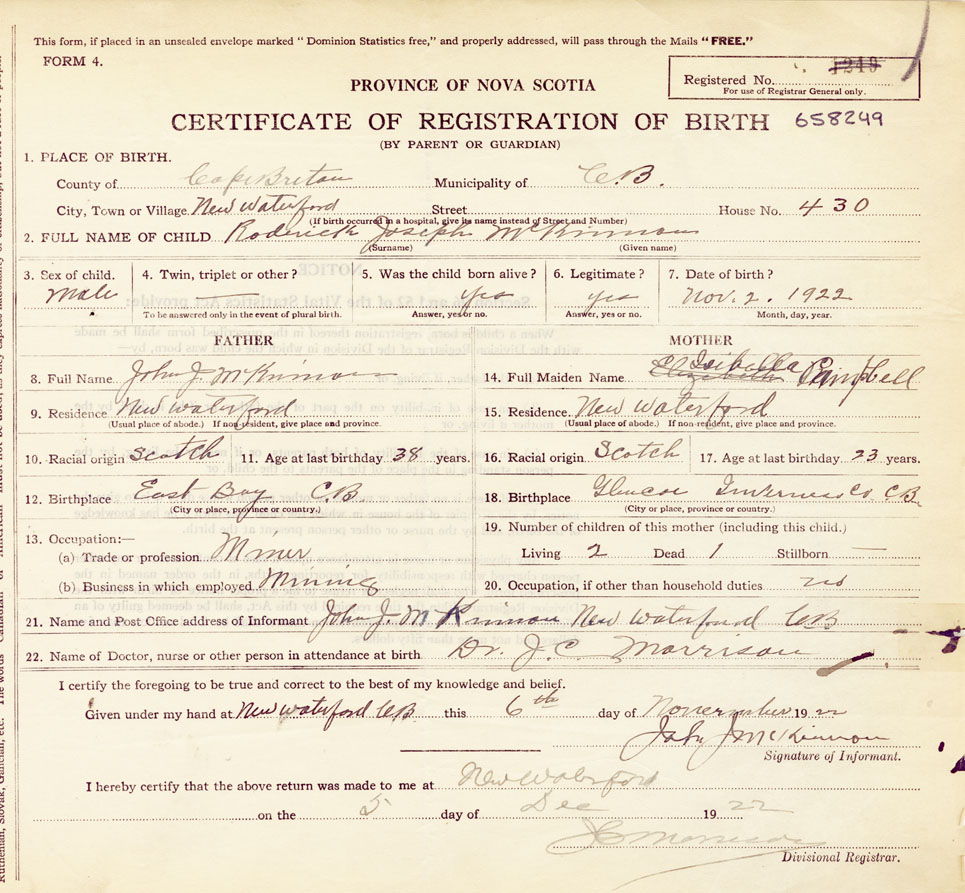 21. Name and Post Office address of Informant John J McKinnon, New Waterford, CB