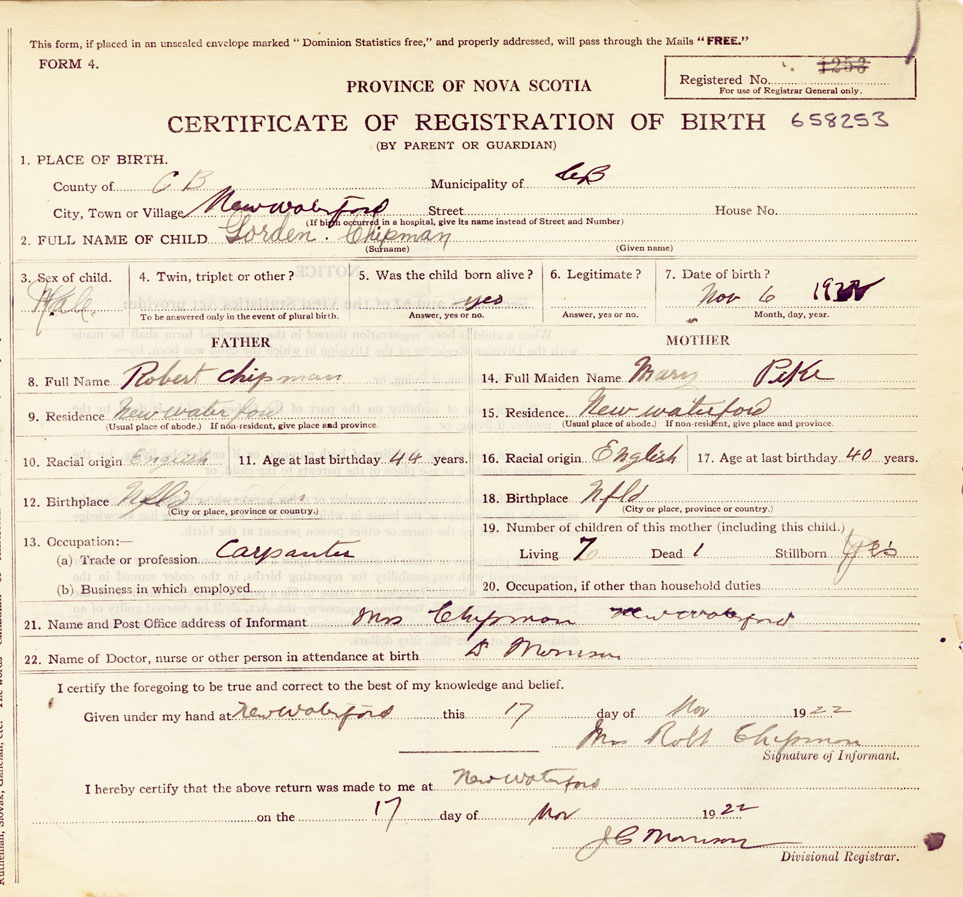 21. Name and Post Office address of Informant Mrs Robert Chipman, New Waterford