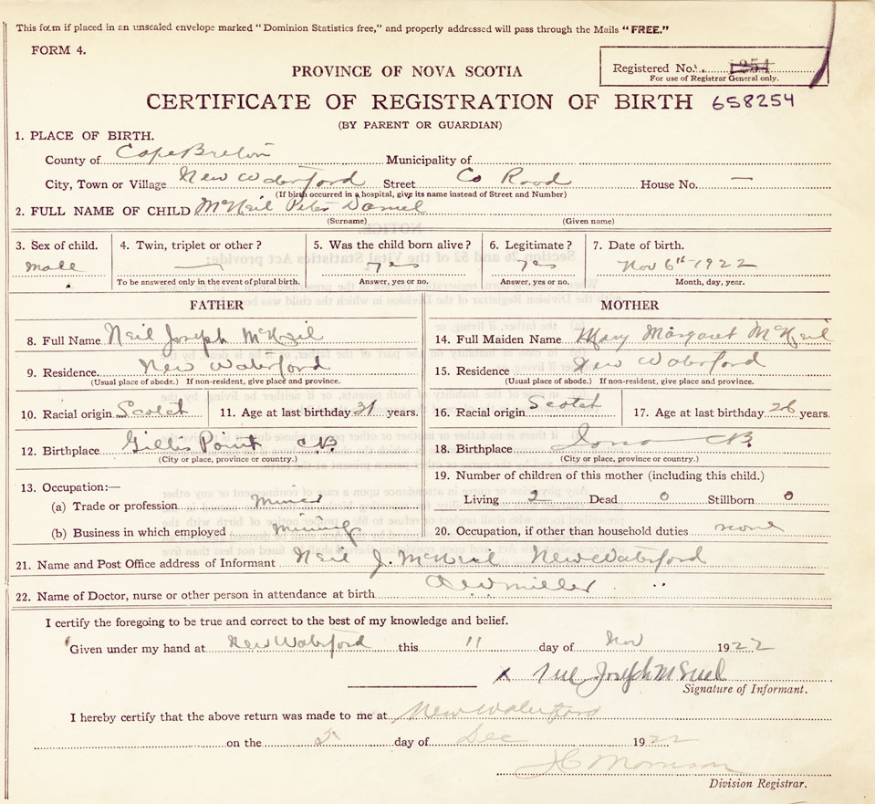 21. Name and Post Office address of Informant Neil Joseph McNeil, New Waterford