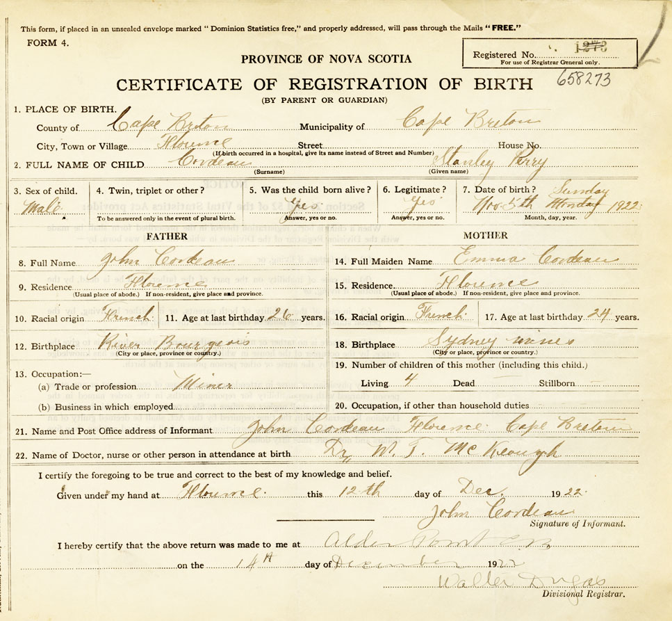 21. Name and Post Office address of Informant John Cordeau Florence Cape Breton